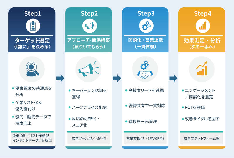 ABMを成功に導くための4つの主要プロセスと、それぞれのプロセスでどのようなタイプのツールが活躍するのかを、図を交えながら分かりやすく解説します。